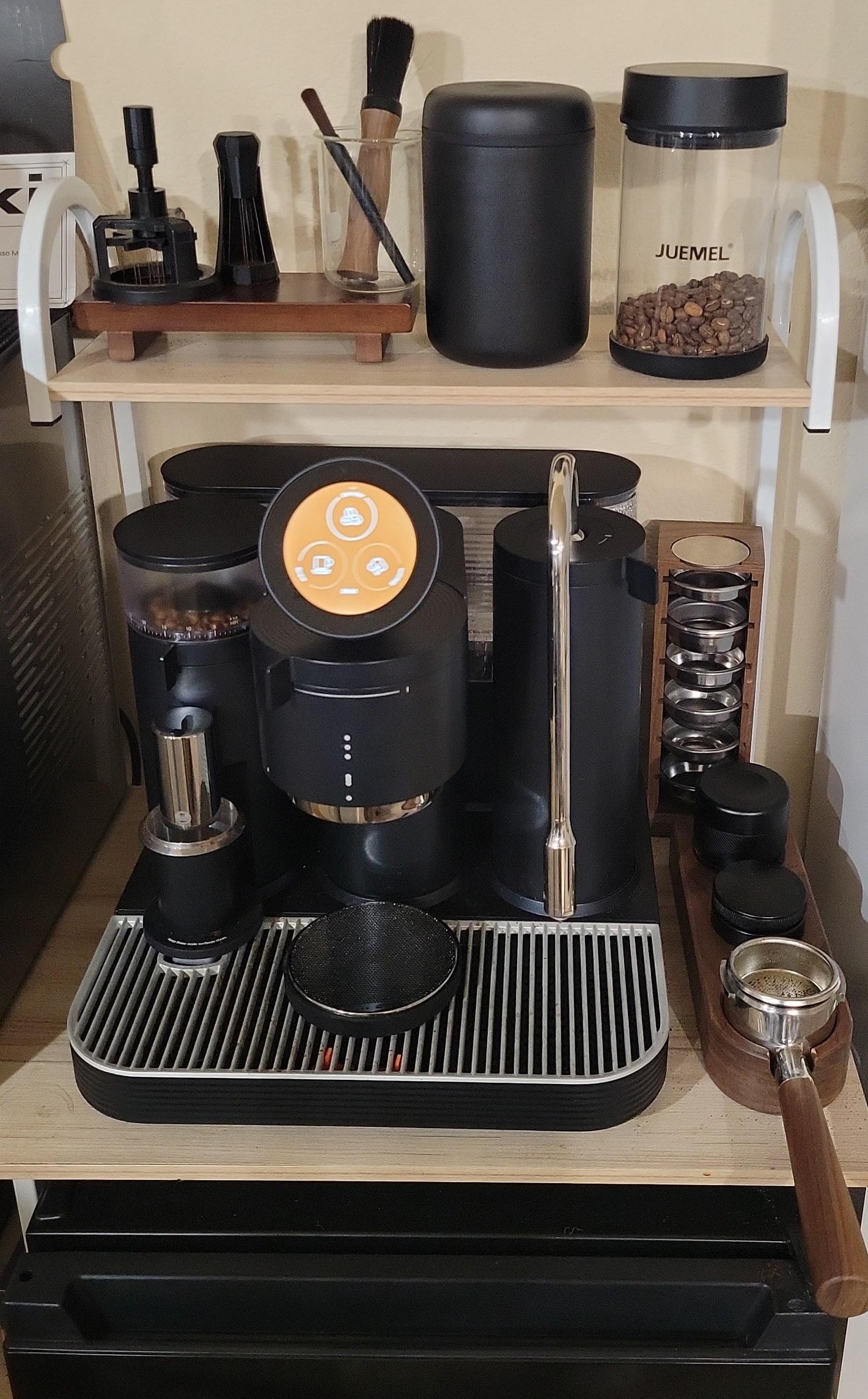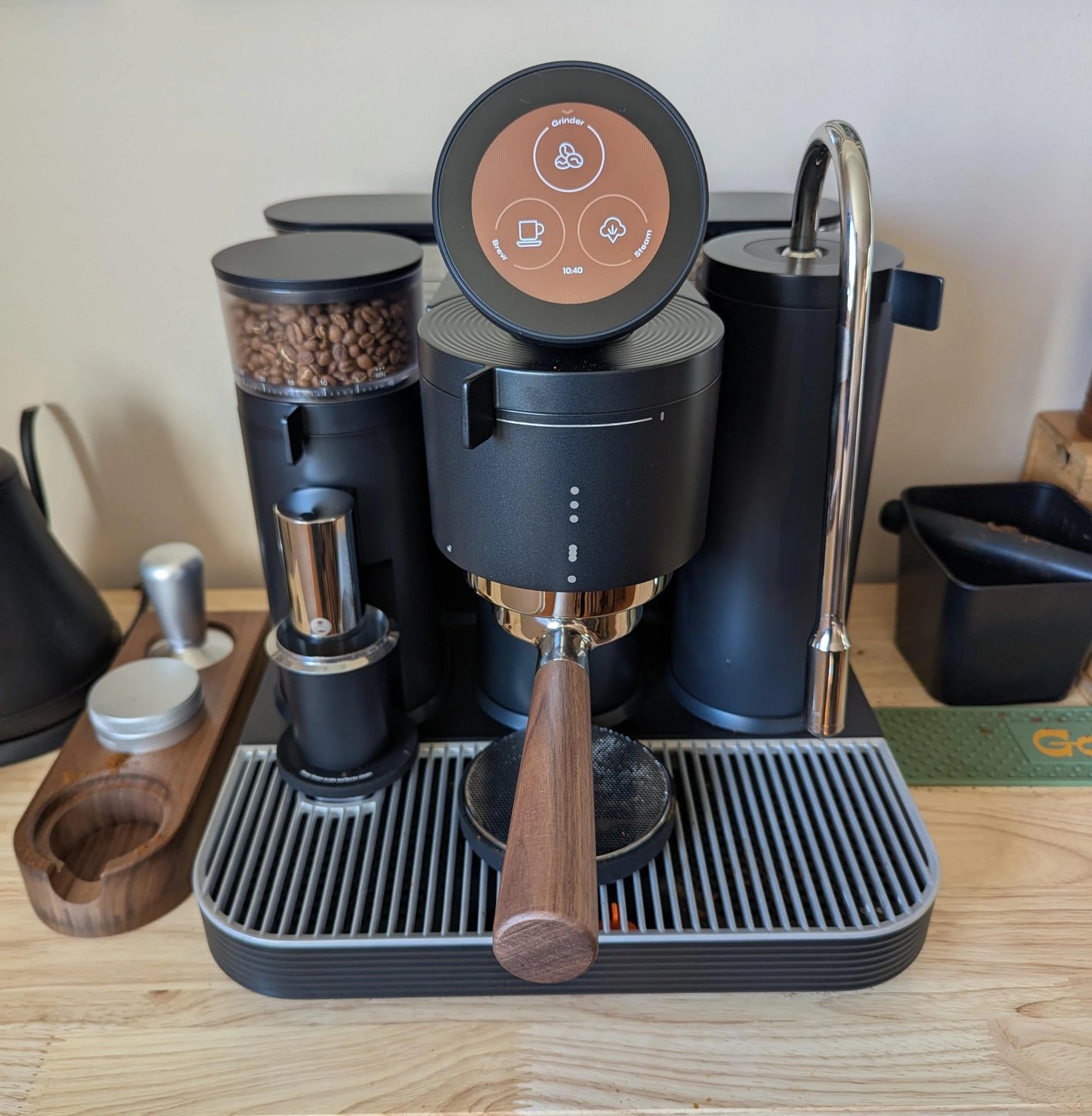 - Grinder co‑diseñado con TIMEMORE®: molido cónico de ~38 mm, sin saltos (stepless), con mitigación de estática y escala integrada — garantizando una molienda uniforme